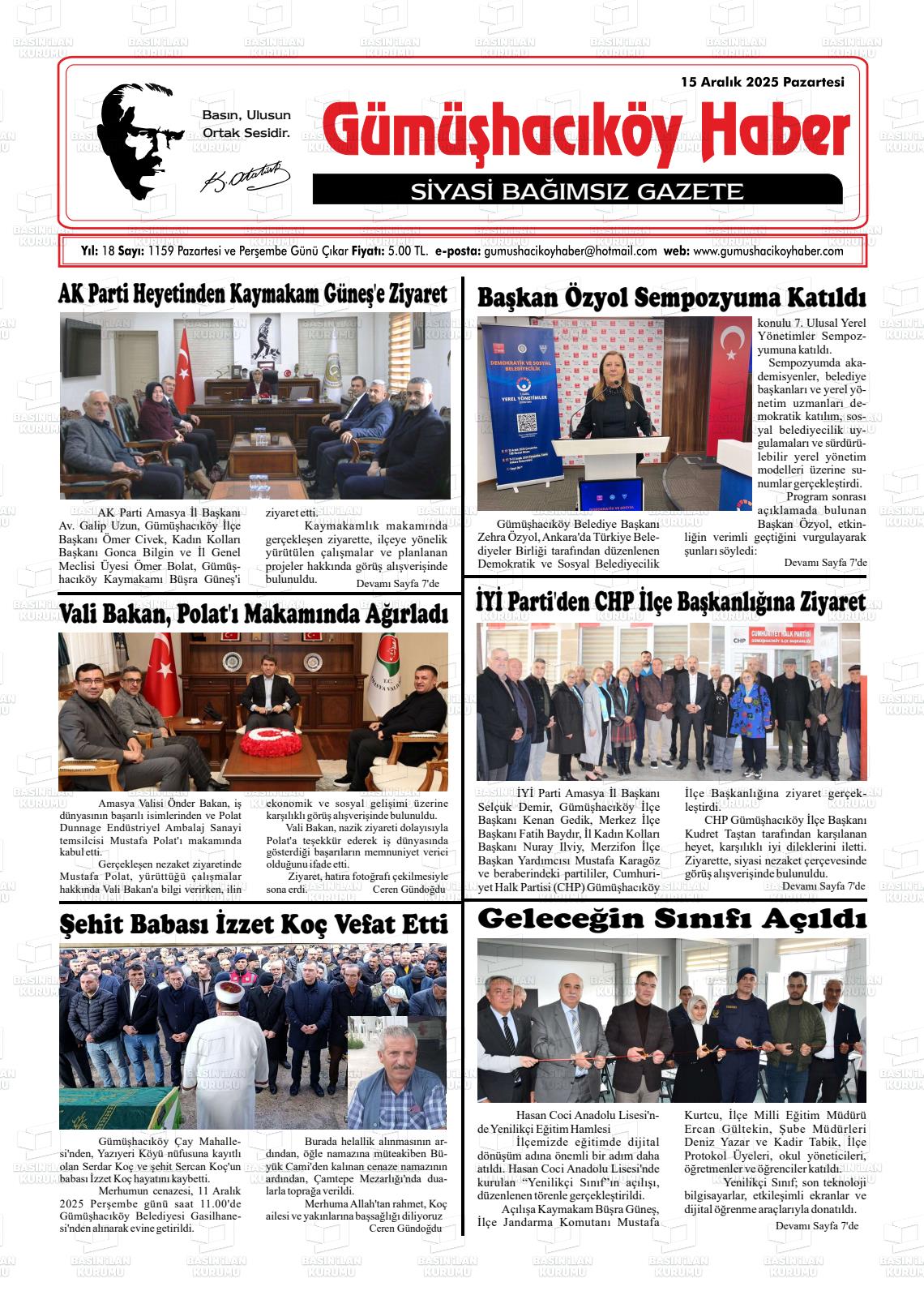 Amasya Yerel Gazeteleri 15 Aralık 2025, Pazartesi Günü Manşeti